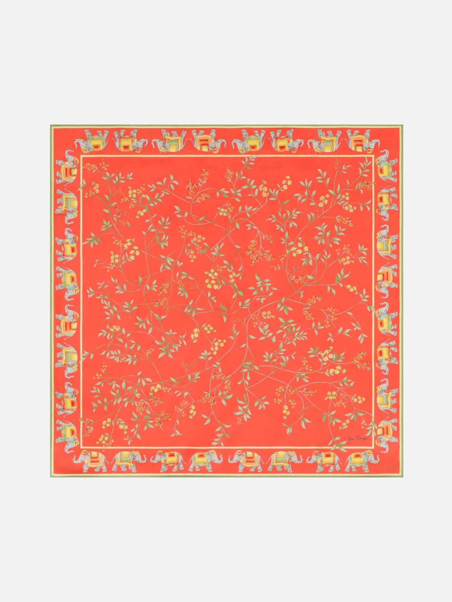 The Floral With Elephant Border Silk Twill Printed Scarf – Orange captures the spirit of Thai craftsmanship with a vibrant floral motif framed by a distinctive elephant border. Rich orange tones lend warmth and vitality, while the border detailing adds a playful yet refined character rooted in heritage.