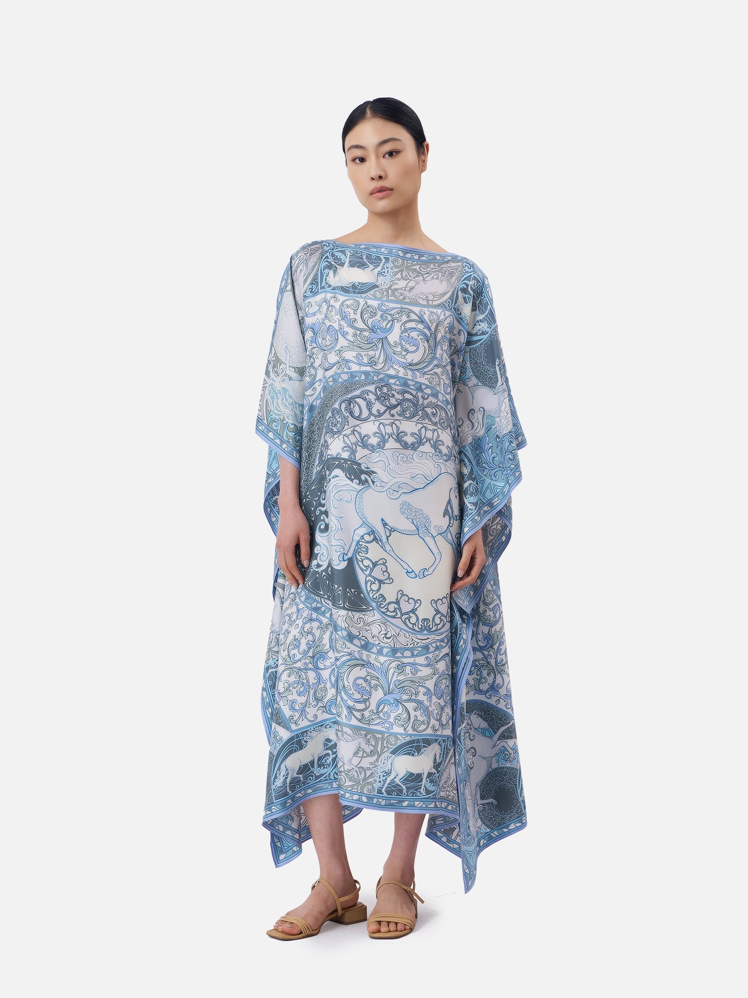 The Horse Zodiac Scarf Kaftan transforms the symbolic elegance of the Chinese zodiac into a flowing, wearable piece of art. Crafted from silk twill, it drapes beautifully with a soft, fluid movement that enhances its relaxed silhouette.