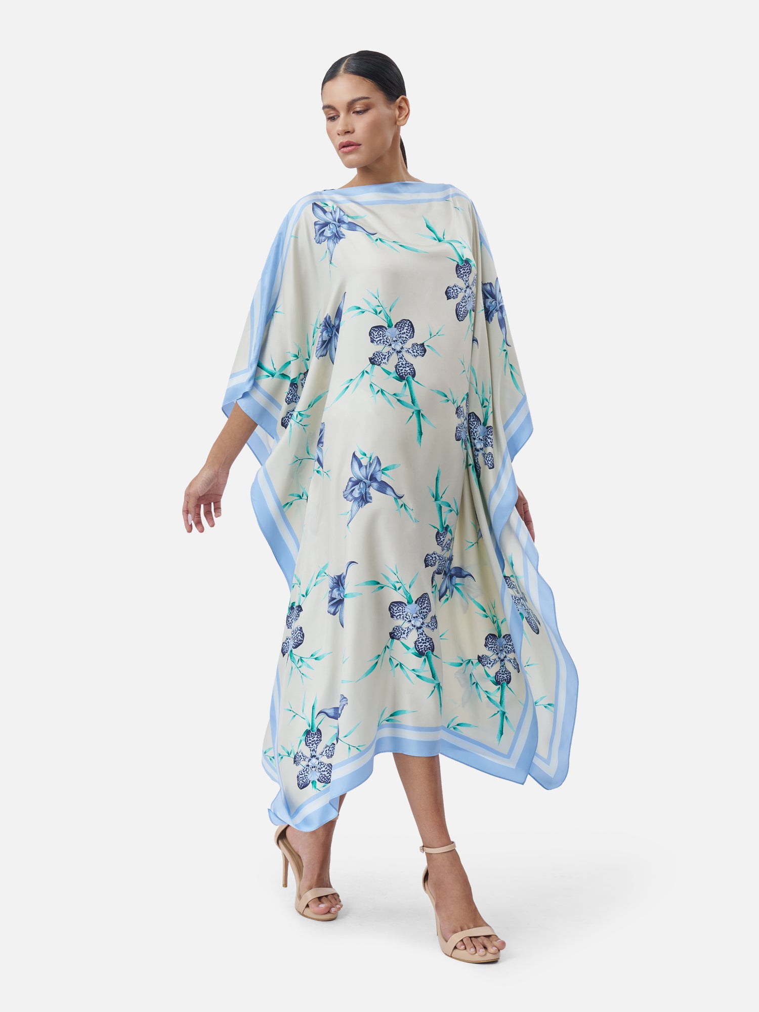 Crafted from silk, the Leela Scarf Kaftan features a relaxed silhouette that drapes effortlessly, offering both comfort and understated sophistication. Its fluid shape creates a graceful movement, making it ideal for both resort wear and refined casual dressing.