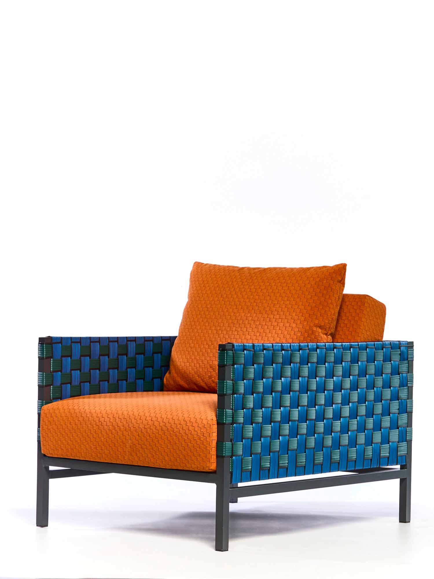 The Pandan Chair celebrates the beauty of traditional weaving through a contemporary lens. Inspired by the simple elegance of handcrafted weave patterns, its design captures the delicate interplay of light and shadow — a tribute to the artistry and human touch behind handmade craftsmanship. The bold colors and linear details of the woven recycled plastic strips bring a modern vibrancy, transforming this chair into a statement of both comfort and design.