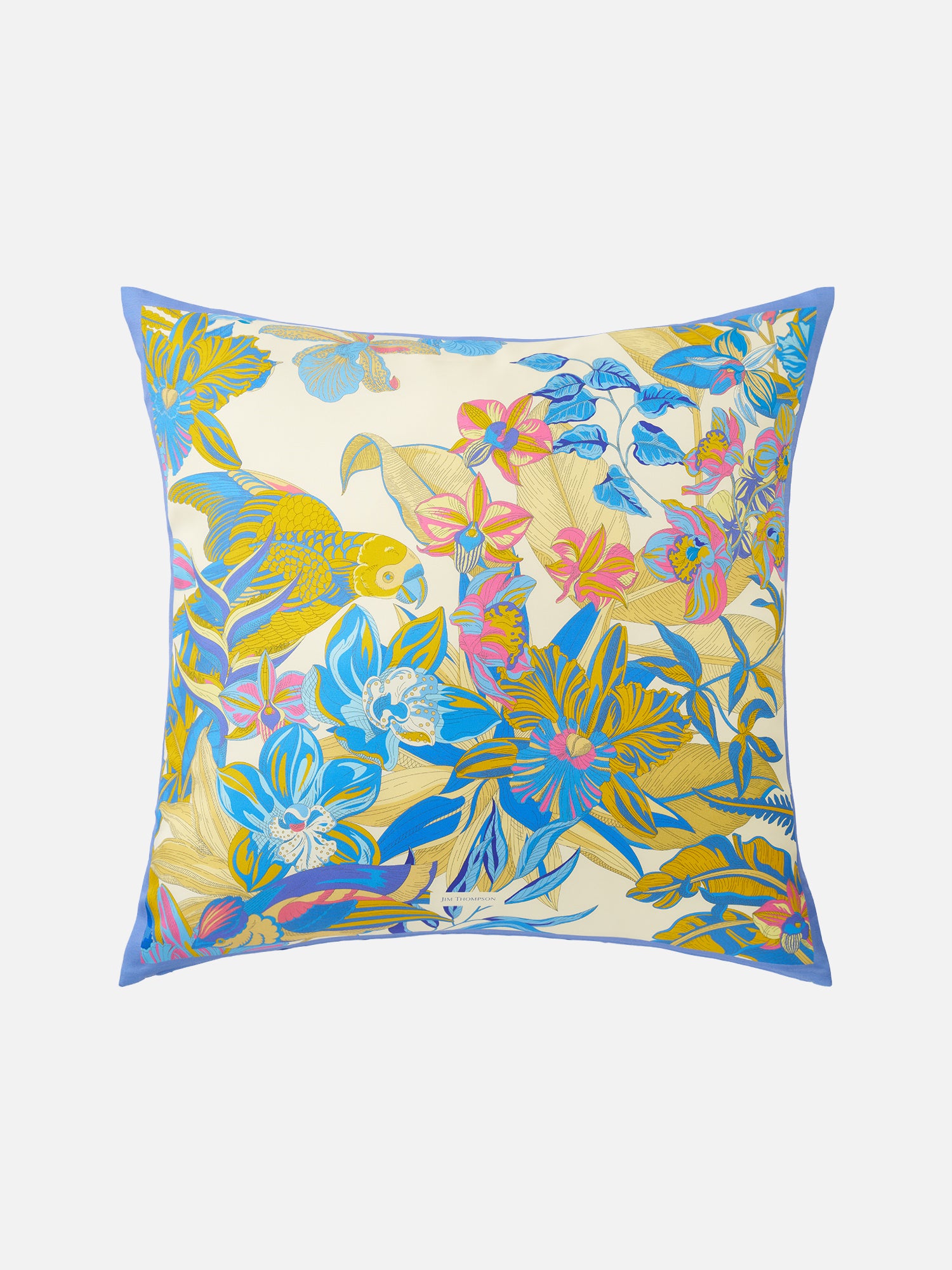 The Parrot Garden Cushion Cover in yellow is crafted from silk, offering a smooth texture and luminous finish. Designed to elevate living spaces, it adds colour and personality to sofas or accent chairs.