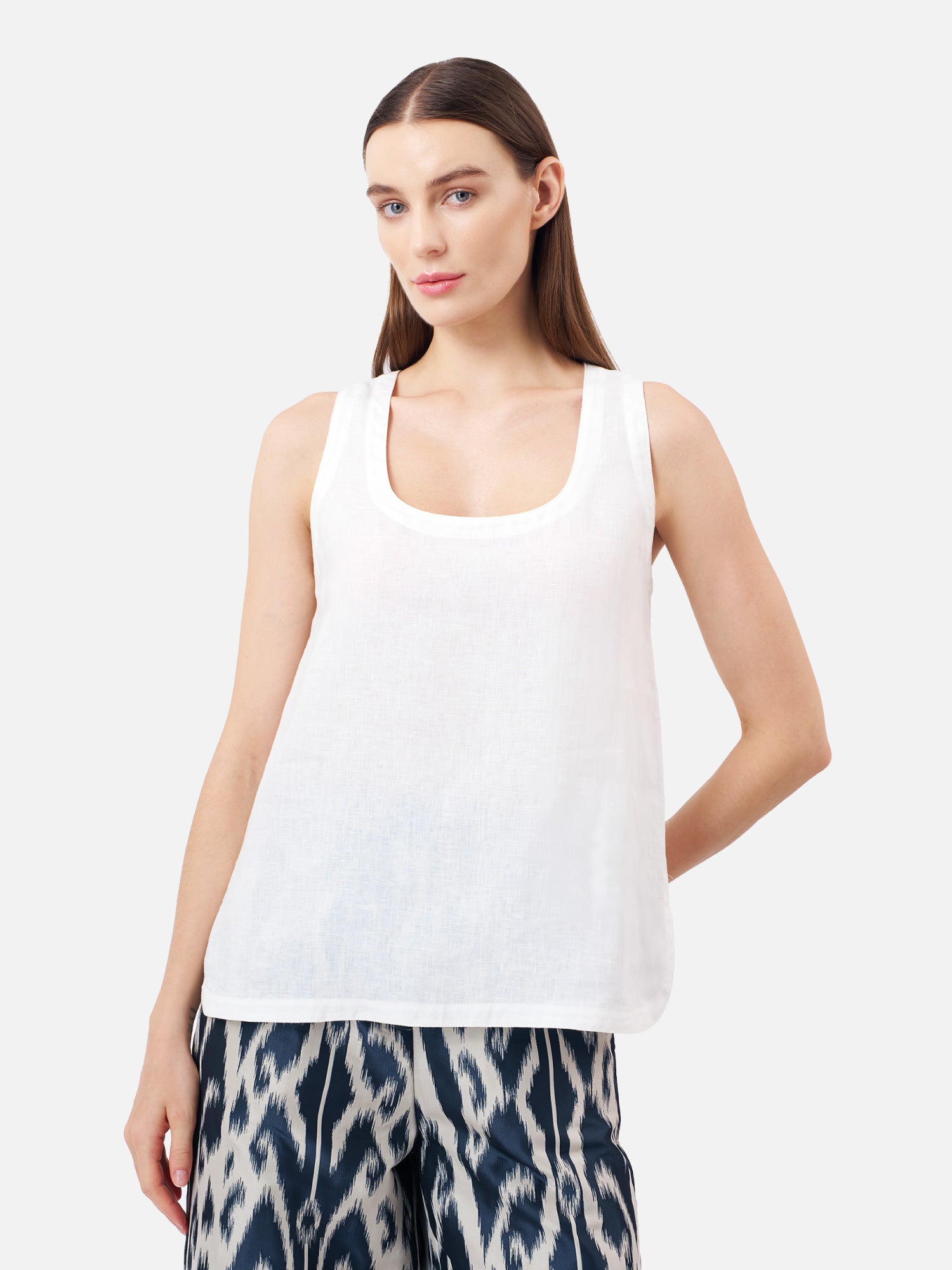 Crafted from 100% linen in White, the fabric provides breathable lightness with a softly textured finish, making it ideal for warm weather dressing. Double stitched piping along the neckline, armholes, and hem adds a refined structural detail that elevates the minimalist design. Side slits at the hem enhance mobility and create a relaxed drape, allowing the piece to fall naturally over skirts, shorts, or tailored trousers.
