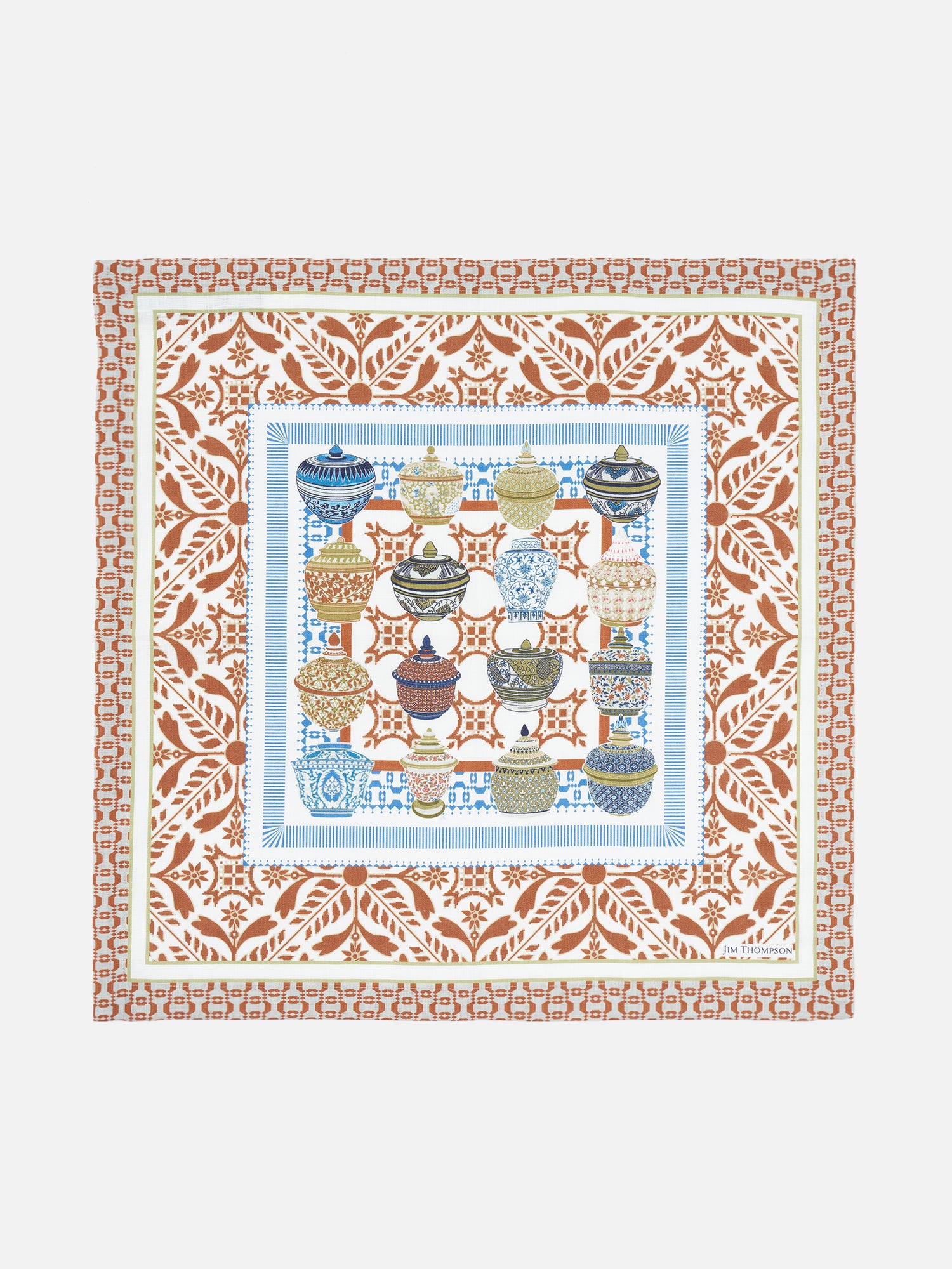 The Story of Pottery print reimagines the beauty of the ceramics displayed in Jim Thompson’s home. Featuring vessels and patterns inspired by pieces from his cherished collection, the design highlights the unique shapes, colors, and Thai craftsmanship that make these objects so distinctive.
