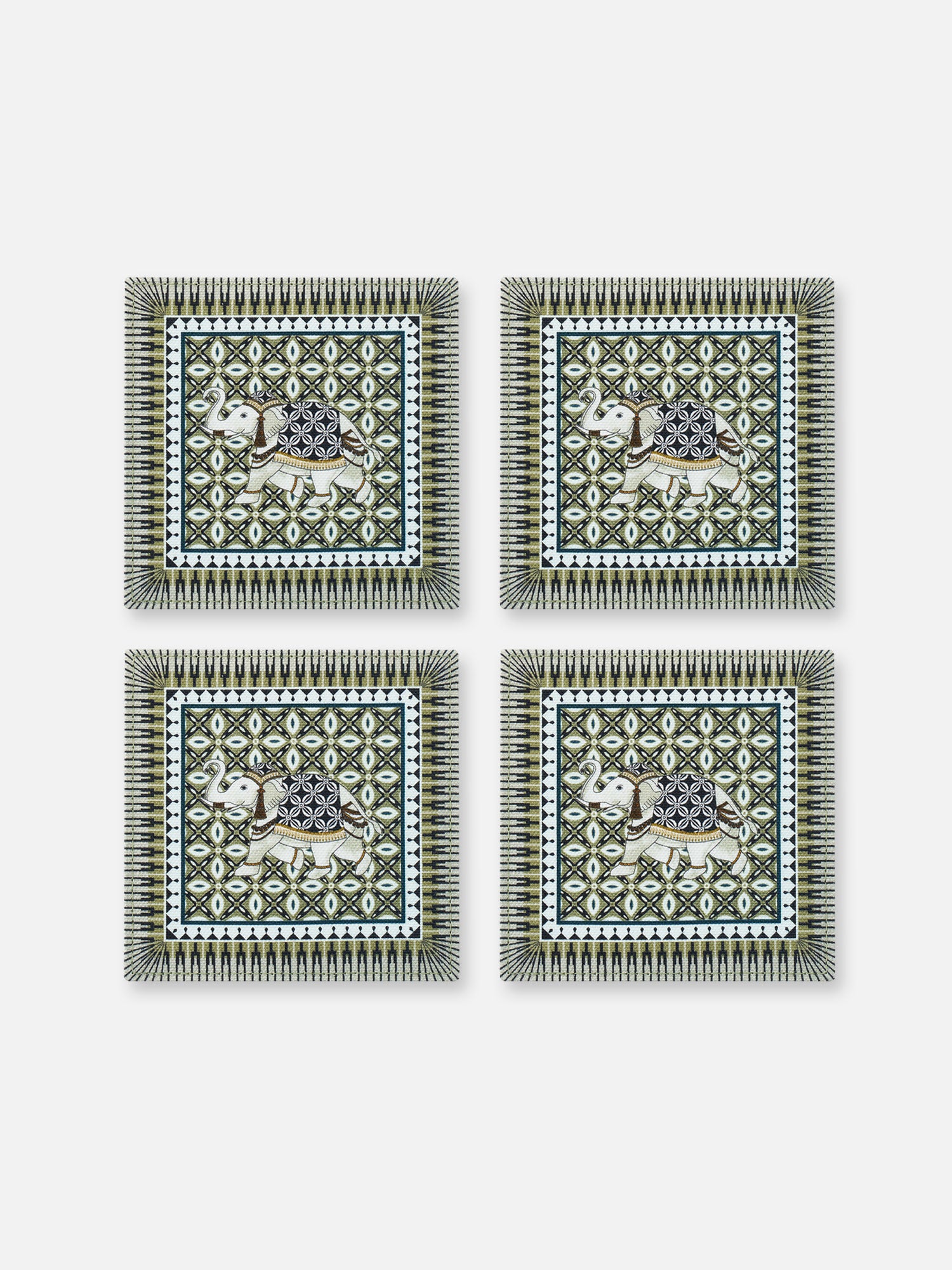 The Tesserae Elephant Cotton Coasters in brown are crafted from cotton, offering durability and decorative appeal. Designed for everyday use, they protect surfaces while adding warmth to table settings.