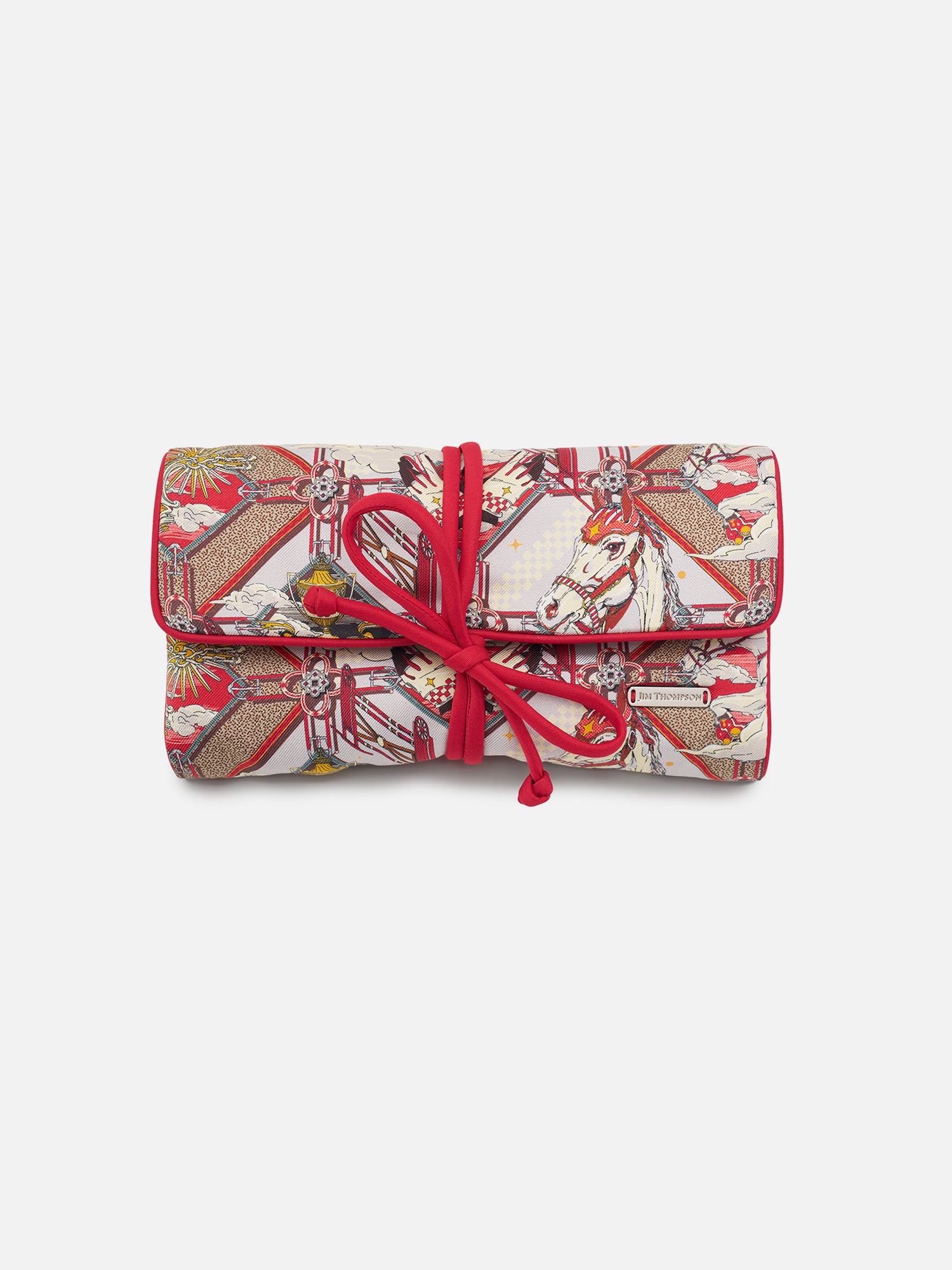 Thoughtfully designed for travel and organisation, the Victory Jewel Roll is crafted from silk in a bold red colourway. When opened, it reveals ample space for jewellery storage, while the Jim Thompson x Pomme Chan print showcases a racehorse in motion—an enduring symbol of perseverance and courage throughout life’s journey.